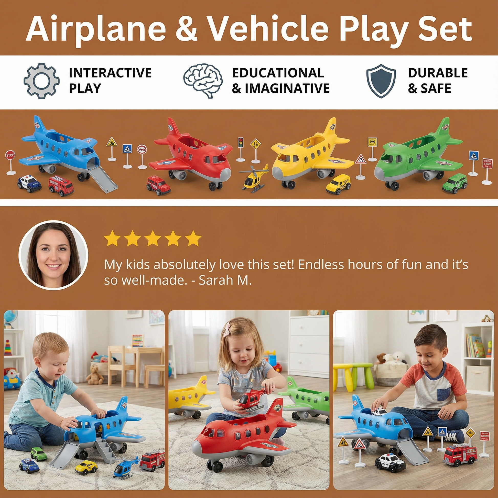 "My son absolutely loves this 2-in-1 airplane and vehicle set! He spends hours loading cars into the plane and creating his own adventures. The quality is great, and it keeps him entertained every single day!"