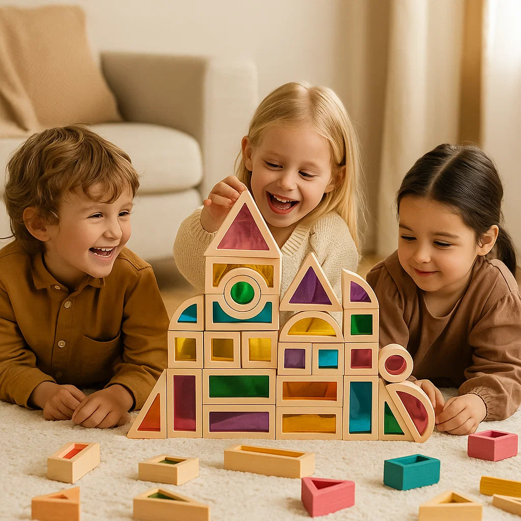 Discover the world of creativity with the creative Montessori wooden building blocks! These high-quality building blocks combine classic wooden toys with colourful, transparent cores that make playing a real experience. Ideal for children to playfully explore colours, shapes and balance while developing their motor skills.